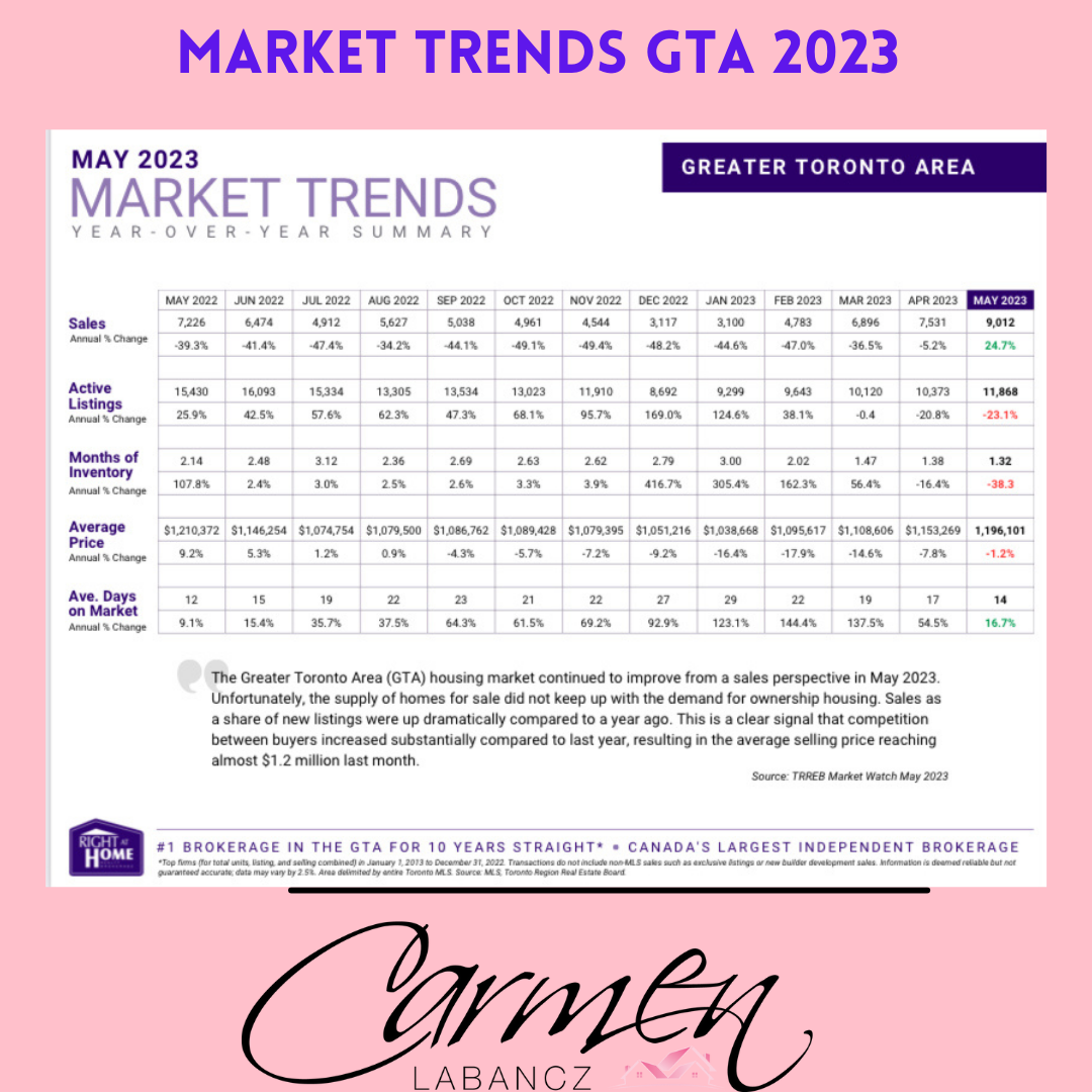 “The Greater Toronto Area (GTA) housing market continued to improve from a sales perspective in May 2023. Unfortunately, the supply of homes for sale did not keep up with the demand for ownership housing. Sales as a share of new listings were up dramatically compared to a year ago. This is a clear signal that competition between buyers increased substantially compared to last year, resulting in the average selling price reaching almost $1.2 million last month.”